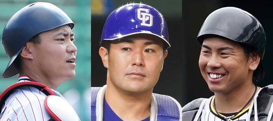 ヤクルト・中村悠平、中日・木下拓哉、阪神・梅野隆太郎(左から)【写真:荒川祐史】
