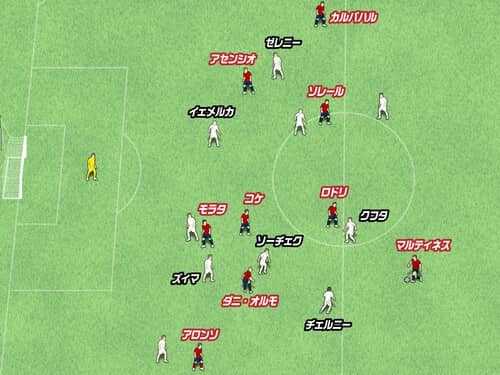 ここでコケを見ていたソーチェクは、ダニ・オルモに右脇に立たれたことで、2人の間で中途半端な対応を取る形となった。そこをうまく使ったのがコケである。コケは中央の空いたスペースでパスを呼び込み、マルティネスはそこへ縦パスを入れた。