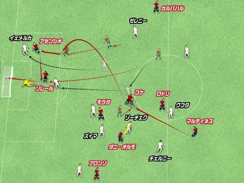 アセンシオは3バックの脇にできるスペースを狙える位置にポジションを取り、コケにパスが入った瞬間に走り出した。そしてコケからのパスでペナルティーエリア深くまで進入し、ヴァーツラフ・イェメルカを釣り出してできたゴール前のスペースにパス。カルロス・ソレールが走り込んでフィニッシュとなった。