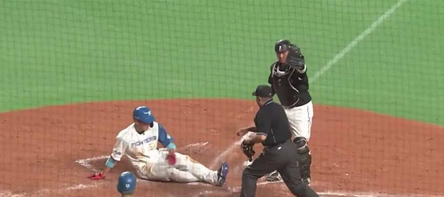3点リードの4回2死二塁で、日本ハム・杉谷の鋭い打球が中堅に転がった。二塁走者の野村が迷わず三塁を蹴って本塁へ突入する中、中堅の高部は助走をつけて右肩を一振り。痛烈な送球が捕手・松川のミットに刺さり、得点を許さなかった。