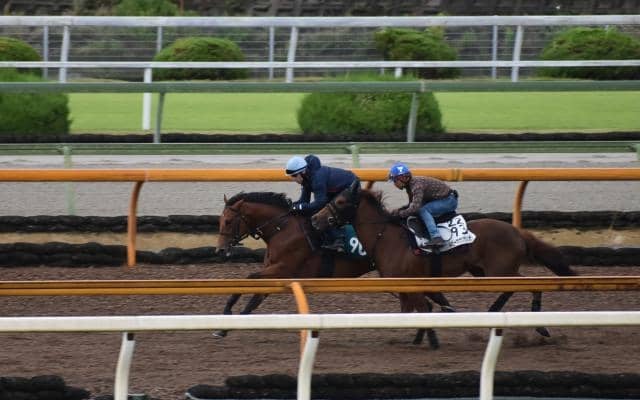 26日(日)阪神5R新馬戦に出走予定のカルロヴェローチェ(写真奥6月15日撮影:井内利彰)