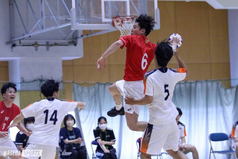 開始直後、村松涼雅(商1=岩手・不来方)が先制点を挙げると、続けて外種子田崚汰(スポ1=鹿児島・国分)がカットインシュートで得点して2-0。まずまずの立ち上がりを見せた早大Bだったが、その後はパスミスが相次ぎ相手に連続得点を許す。優位な状況から一転、2-4と逆転された。しかしここで、山田和直副将(スポ4=群馬・富岡)と外種子田が気を吐いた。山田が連続して相手ゴールを割ると、外種子田がサイドシュートを決めて同点に追いつく。直後に角辻尚樹(スポ4=奈良・畝傍)が速攻で得点し10-8と再度逆転に成功した。終盤は、ゴールキーパーの攻撃参加(※1)で手薄になった相手ディフェンスにつけこんでリードを広げ、16-9で第1セットを奪った。