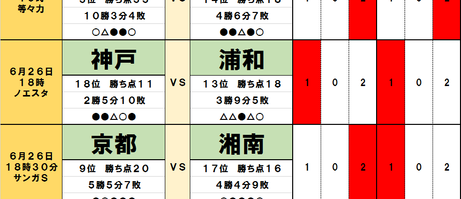 今回のtotoではJ1第18節の9試合とJ2第23節の4試合が対象となっている。過去のデータや直近の様子などから、分析…