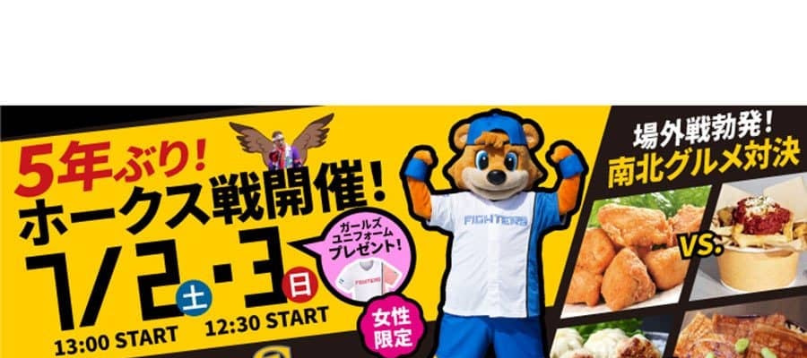 鎌ケ谷で行われるソフトバンク戦は5年ぶり。球場正面広場には、北海道と九州の名物グルメが登場する。北からは帯広豚丼を扱う「BUTASAN」から豚丼、豚トロ丼、北海道じゃがいもが自慢の「ASOMBROSO」からはオリジナルメニューがそれぞれキッチンカーとして出店。また、南からはこれらに対抗し、「博多八助」から博多一口餃子、「元祖中津からあげもり山」からは骨なしむね肉も登場する。