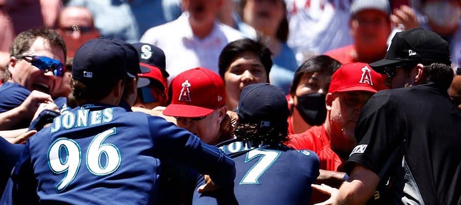 乱闘の“輪の中心”に入ろうとする大谷翔平を水原一平通訳が制止している■エンゼルス 2ー1 マリナーズ(日本時間27日・ア…