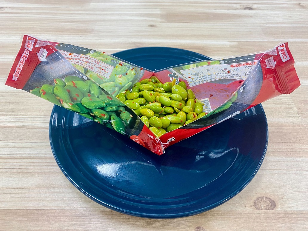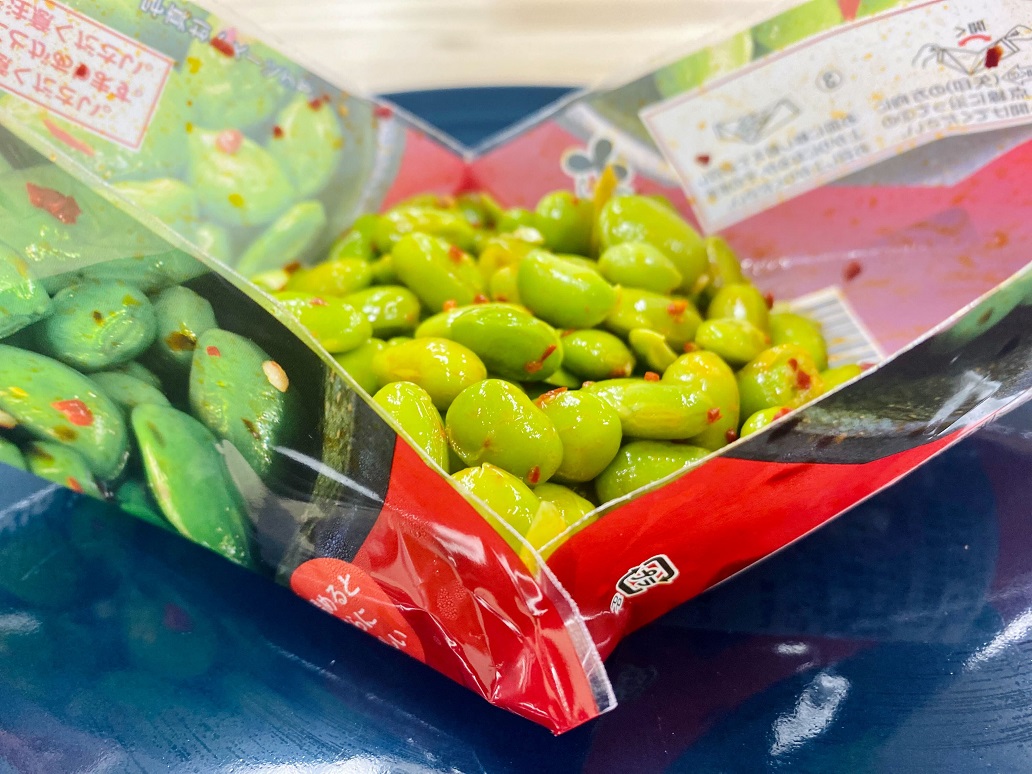 味と量と値段公式サイトで「ボイルしたむき枝豆をペペロンチーノソースとガーリックパウダーで味付けしました」と記載がある通り、濃いめの味付けでお酒や炭酸水によく合います。封を開けるとガーリックフレーバーを感じますが、食べた後もニンニクくささがまったく残らないので、いつ食べても安心。唐辛子が見えていますが、辛さはほとんど感じません。
