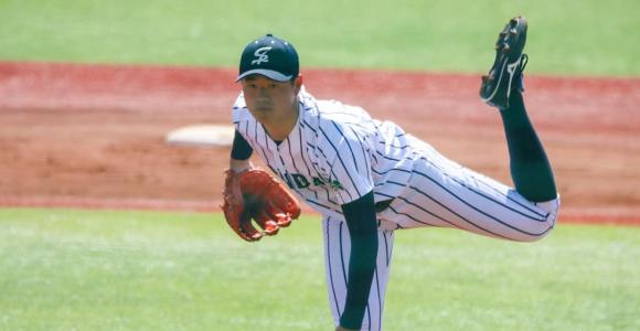 仙台大からプロ入りした初の左投手・大関友久投手が、一軍の舞台で快投を続けている。強力投手陣を誇る福岡ソフトバンクホークスの先発ローテーションに定着し、ここまで5勝3敗、防御率1.94(6月27日現在)。6月25日の日本ハム戦では、今季2度目の完封勝利を挙げた。