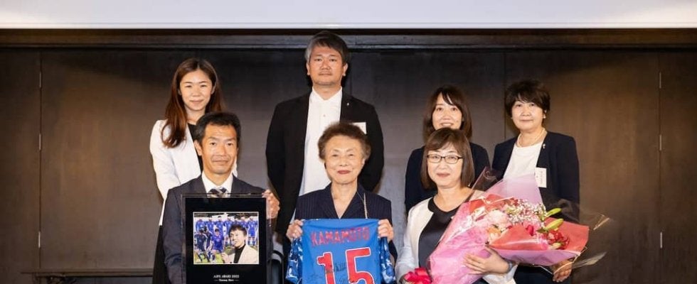 AJPSアワードの表彰式で、「KAMAMOTO 15」のユニホームを手に、日本ブラインドサッカー協会の人びとに囲まれる釜本美佐子さん (c)K.Ishii/AJPS