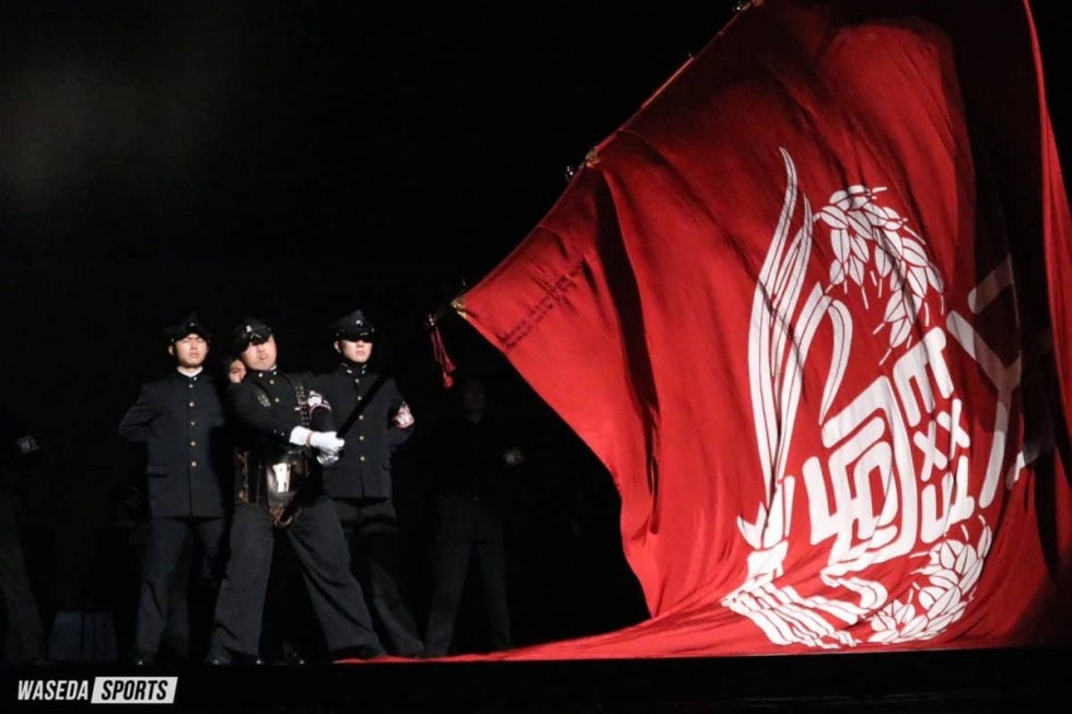 オープニングが終わると、メインである各校による校歌、応援曲のステージが始まった。早稲田の出番は4番目。始めに行われた校旗紹介では、旗手の井上皓介(法4=東京・早大学院)によって大校旗が掲げられた。吹奏楽団の演奏する『早稲田の栄光』に合わせ、校旗が左右に大きく翻る『昇り龍』はまさに荘厳の一言。その様子に観客は息を呑んだ。