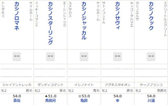 昨年の九州産馬限定の2歳新馬戦でも、出走16頭のうち「カシノ」冠5頭、「テイエム」冠3頭が名を連ねていた。なお、それぞれの最先着は6着(カシノコマンド)、3着(テイエムキバイモン)と勝利には至らなかった。今年はカシノ・テイエムともにリベンジがかかる一戦となる。