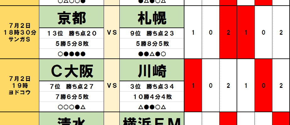 今回のtotoではJ1第19節の9試合とJ2第24節の4試合が対象となっている。過去のデータや直近の様子などから、分析…