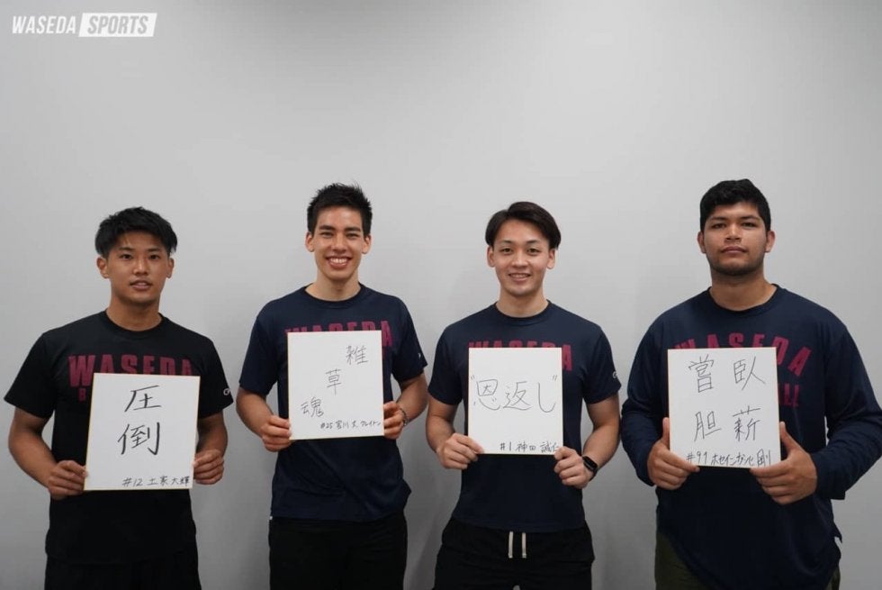 第80回早慶定期戦(早慶戦)が7月2日、3年振りの有観客で東京・代々木第二体育館で開催される。早慶戦を間近に控える中、最後の早慶戦となる4年生の神田誠仁主将(社4=静岡・浜松開誠館)、土家大輝(スポ4=福岡大大濠)、宮川丈クレイトン(商4=愛知・千種)、ホセイン剛(教4=東京・早実)にお話を伺った。