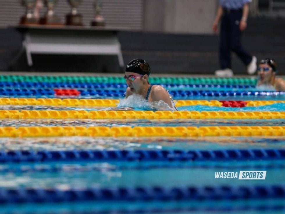 女子部も、選手それぞれが力を発揮。早大選手同士の争いとなった女子200メートル個人メドレーでは、スタートから松本が飛び出す展開となる。松本は昨年のインカレ同種目覇者として、最後まで他を寄せ付けない圧倒的な泳ぎを見せ、見事大会新記録での優勝を飾った。また、50メートル自由形でも今牧まりあ(スポ3=長野・飯田)と松本が大会記録を更新し、ワンツーフィニッシュ。女子の最終種目として実施された4×200メートルフリーリレーは、今牧、松本、小原天寧(スポ2=東京・目黒日大)、ルーキー船越彩椰(スポ1=東京・淑徳巣鴨)のオーダーで臨み、大会記録に迫る8分18秒82をマーク。慶大を相手に大差をつけ圧勝した。