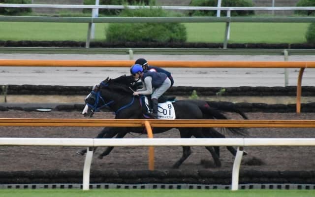 函館記念への出走に向け1週前追い切りを行ったサンレイポケット(写真手前、撮影:井内利彰)