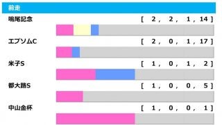 過去10年で最多5頭が馬券に絡んでいる前走・鳴尾記念組は【2-2-1-14】 勝率10.5%、連対率21.1%、複勝率26.3%。同じく優勝2回の前走・エプソムC組。残りは優勝1回が棲み分け、2着2回のローテも横一線、難解なレースと言える。