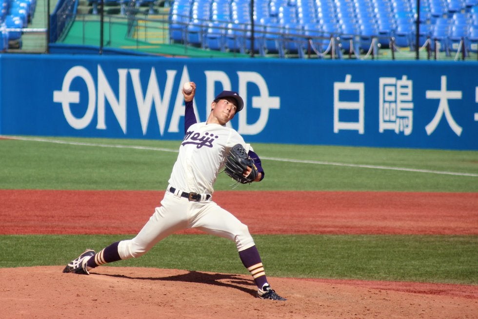 明大の先発・森下暢はこの日も8回1失点の好投=神宮球場