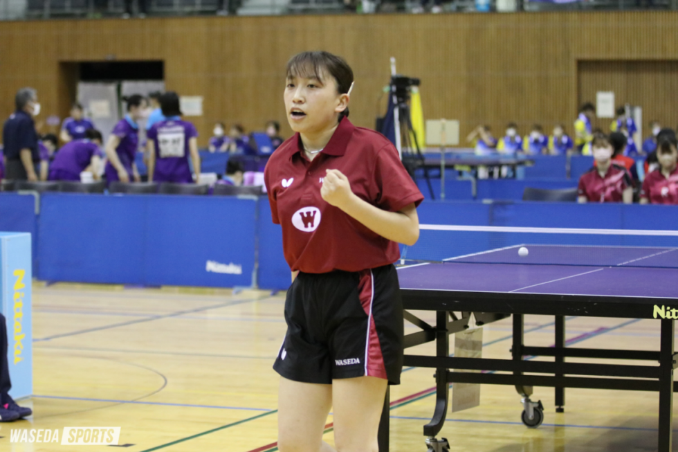 この日の1番手を任されたのは黒野葵衣主将(スポ4=東京・武蔵野)。カットマンの黒野に対して相手は攻め急がず、長いラリーが多くなる。相手のコースを突いたショットに対してミスが増え、第2ゲームを奪われる。それでも第3ゲーム、3点ビハインドから6-6と追い付くと、そのまま5連続ポイント。11-6でこのゲームを奪い返した。続くゲームでは、チャンスでのミスが続き、終盤まで競り合いとなる。それでもサービスエースでマッチポイントを奪うと、最後は長いラリーをものにし、12-10。チームに1勝目をもたらした。