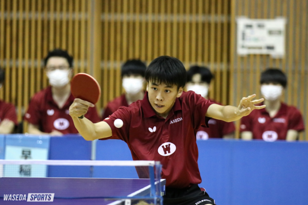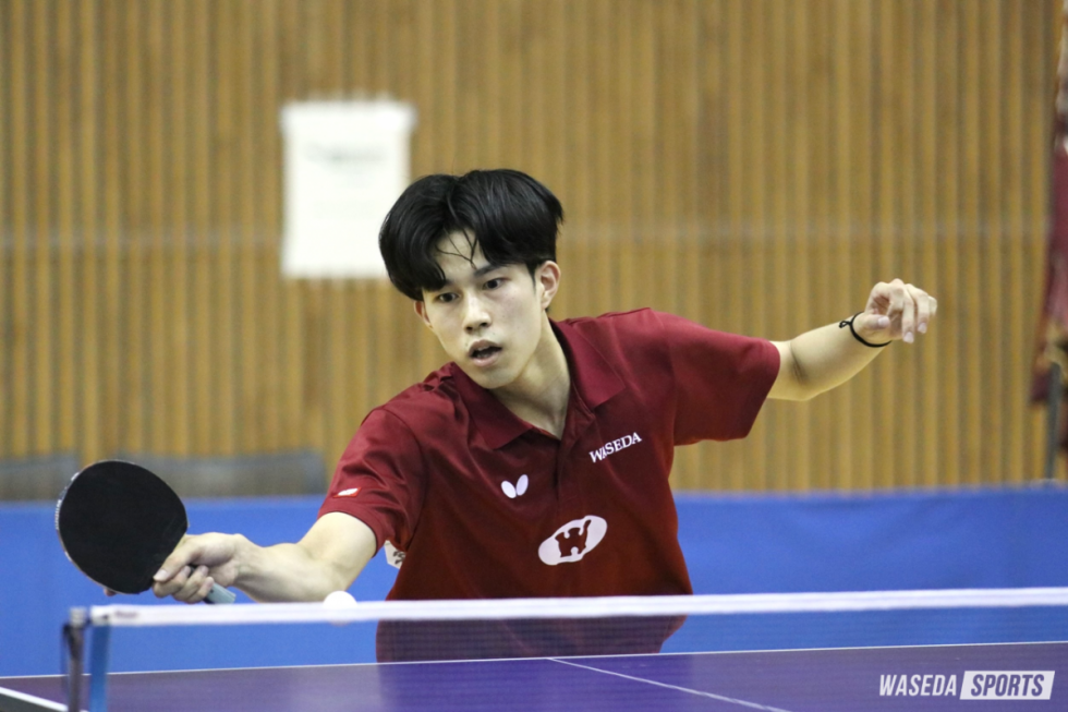 2勝目を奪い、勝利まであと1勝とした早大。4番の杉本和也(スポ3=福岡・希望が丘)と5番の岩永の試合が同時に行われることとなった。しかし、先に岩永が敗れ、早大の命運は杉本に託された。第1ゲームを落とす立ち上がりとなった杉本だったが、その後は勝負所でフォアハンドが決まり、2ゲームを連取。ゲームカウント2-1で第4ゲームへ突入した。しかし、いきなり相手に5連続得点を許し、その点差を詰められない。バックハンドに集められ、対応に苦しんだ。そのまま大差でこのゲームを献上すると、最終ゲームに入っても悪い流れが続いた。サーブ周りで相手にプレッシャーをかけられ、点差が開いていく。最後はバックハンドがアウトになり、5-11。早大の敗戦が決まり、2015年以来のベスト4進出とはならなかった。