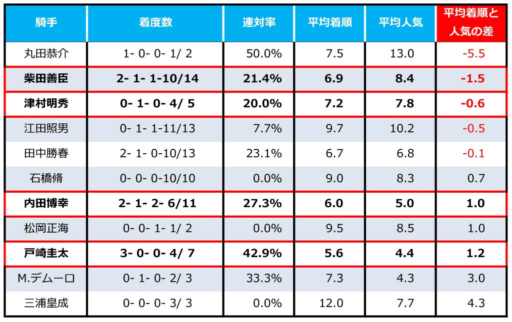 騎手によって騎乗数にバラつきが見られるため、過去5回以上の騎乗経験がある7名を中心に見ていきましょう。その7名の中で着順と人気のバランスに優れ、連対率も20%以上と上々の数値を記録できているのが柴田善臣騎手と津村明秀騎手です。