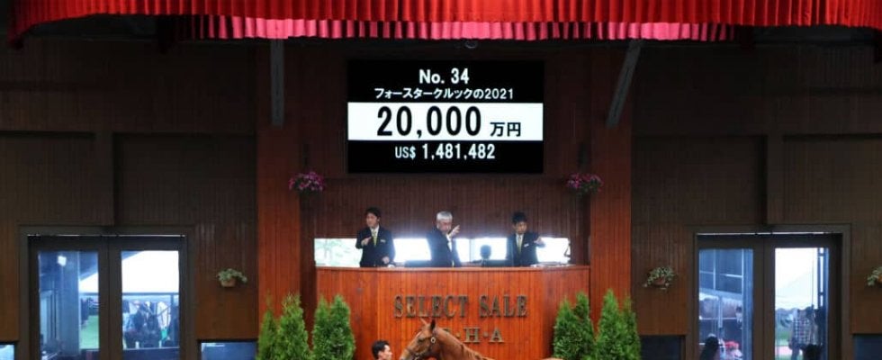 11日、北海道苫小牧にあるノーザンホースパークで、日本最大のサラブレッド市場「セレクトセール2022」が開催。1歳馬セールにて上場番号34番・フォースタークルックの2021(牡)が2億円で落札された。
