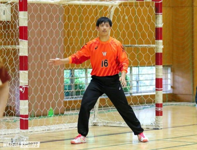 関学大ボールで始まったこの試合、先制点が欲しい早大だったが、前半3分にペナルティースローを与えてしまう。このピンチに替わって入った渡辺航平(人2=神奈川・桐光学園)が好セーブを見せ、先制点を許さなかった。渡辺が引き寄せた流れから狩野直樹(スポ3=埼玉・浦和学院)が豪快なミドルシュートを決め、先制に成功。その後も粘り強いディフェンスから田井健志(スポ3=香川中央)の速攻や白築琢磨(文構2=東京・早実)のミドルで得点を重ね、序盤から試合を優位に進めていった。ディフェンスではGK塚本智宇(スポ3=富山・高岡向陵)が好セーブを連発し、相手に流れを渡さない。守備でつくった良いリズムから中惣健友(スポ4=石川・小松)や山田和直副将(スポ4=群馬・富岡)が得点を量産し、17-11と6点リードで前半を終えた。