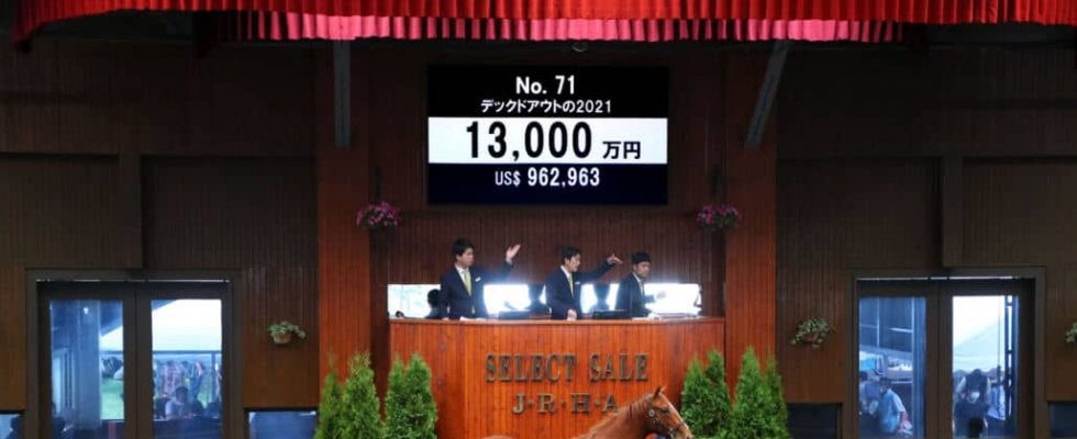 11日、北海道苫小牧にあるノーザンホースパークで、日本最大のサラブレッド市場「セレクトセール2022」が開催。1歳馬セールにて上場番号71番・デックドアウトの2021(牡)が1億3000万円で落札された。