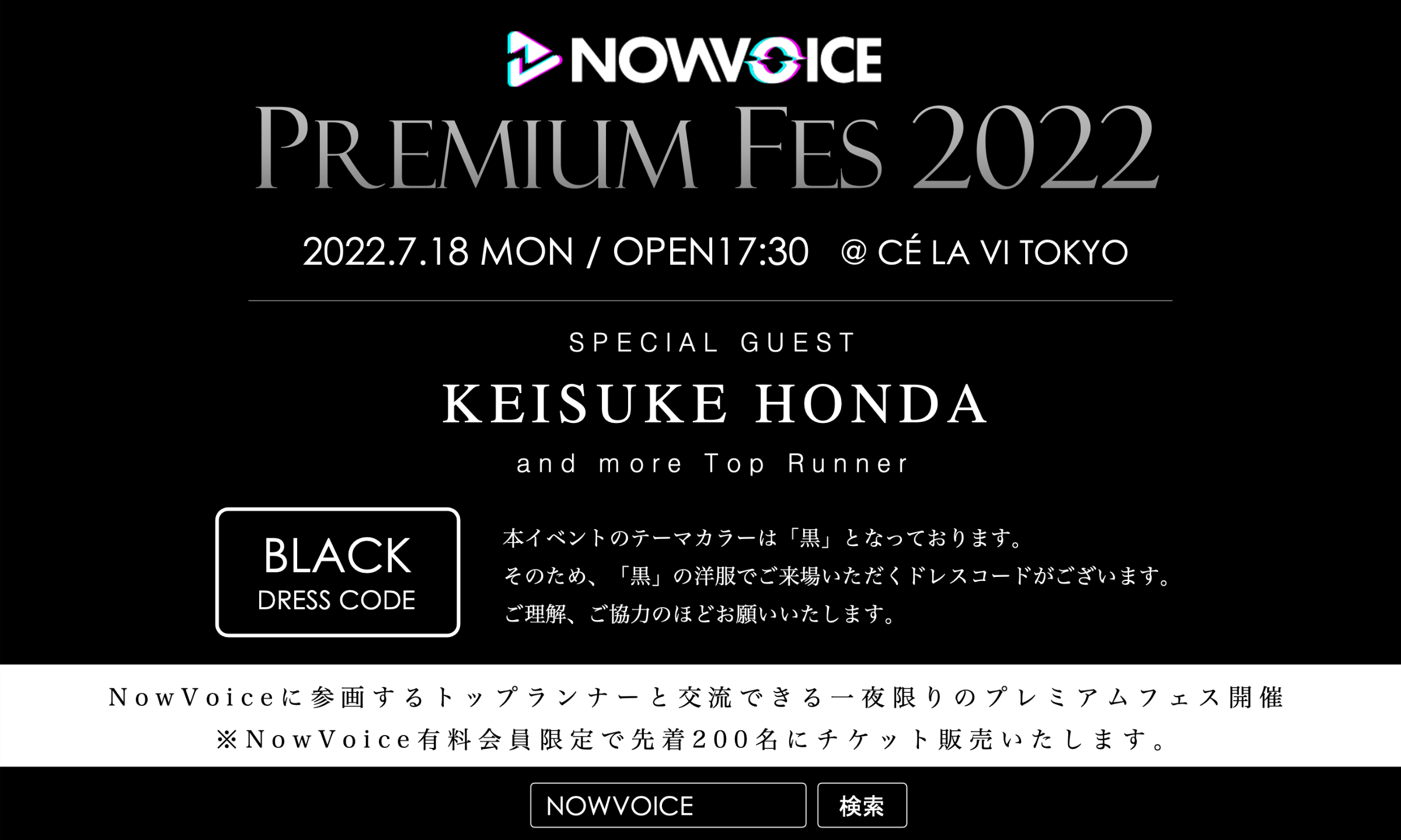 本田圭佑がCEOを務めるNow Do社と、スポーツメディア「SPORTS BULL(スポーツブル)」を運営する運動通信社が共同運営するプレミアム音声サービス「NowVoice」で、初となるリアルイベントの開催が決定した。その名も「NowVoice PREMIUM FES 2022」。