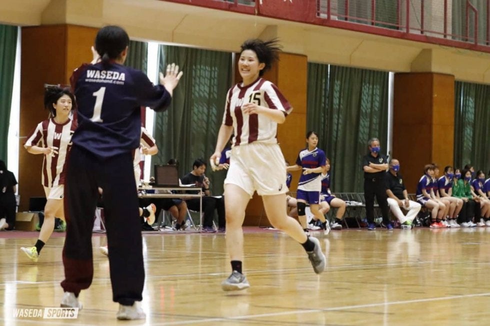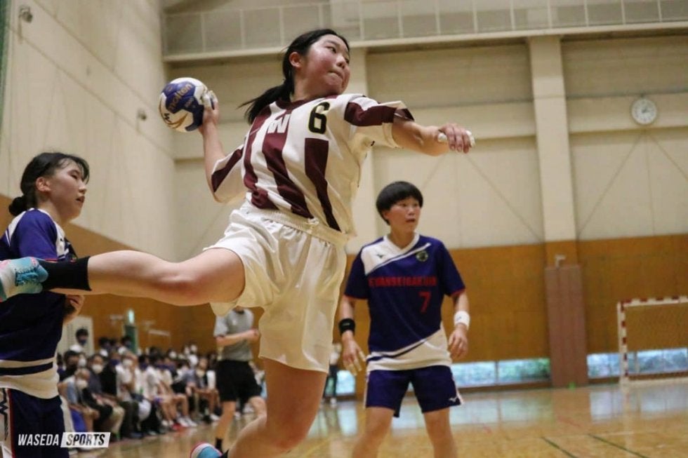 序盤は早大の早い攻撃が光る。LB山野紗由(スポ1=北海道・釧路江南)がCB村上楓副将(スポ3=福岡・明光学園)のパスから先制点を奪うと、早大は5連続でシュートを決め、前半5分で5-2の3点差をつける。しかしその後は点数が入らず、同点に追い付かれてしまう。ここから両者譲らない展開となるが、浦野詩織(スポ3=愛知・旭丘)の力強いシュートでの連続得点や関学大の退場による数的優位を活かした攻撃で得点を重ね、早大は常にリードを守る。試合中には、GK江連織圭主将(スポ4=千葉・昭和学院)が自陣から相手ゴールを直接狙う場面も何度か見られた。前半終了間際にはRW青木里奈(スポ3=東京・白梅学園)がサイドシュートを突き刺し、2点のリードで前半を終える。