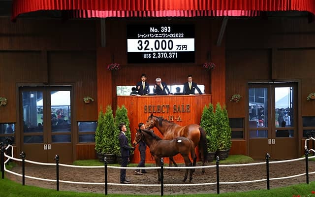 12日、苫小牧・ノーザンホースパークで行われている日本最大のサラブレッド市場「セレクトセール2022」当歳馬セールにて、上場番号393番・シャンパンエニワンの2022(牡)が3億2000万円で落札された。