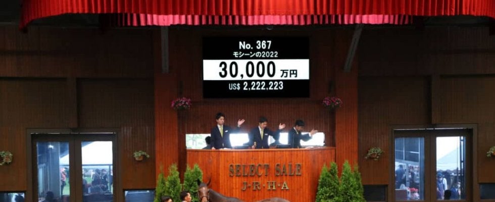 12日、北海道苫小牧にあるノーザンホースパークで、日本最大のサラブレッド市場「セレクトセール2022」が開催。当歳馬セールにて上場番号367番・モシーンの2022(牡)が3億円で落札された。