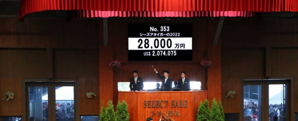 12日、北海道苫小牧にあるノーザンホースパークで、日本最大のサラブレッド市場「セレクトセール2022」が開催。当歳馬セールにて上場番号353番・シーズアタイガーの2022(めす)が2億8000万円で落札された。