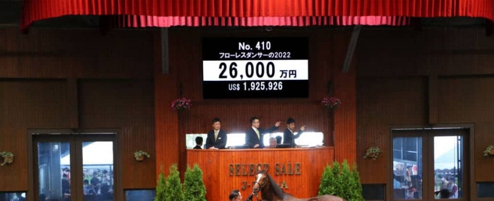12日、北海道苫小牧にあるノーザンホースパークで、日本最大のサラブレッド市場「セレクトセール2022」が開催。当歳馬セールにて上場番号410番・フローレスダンサーの2022(牡)が2億6000万円で落札された。