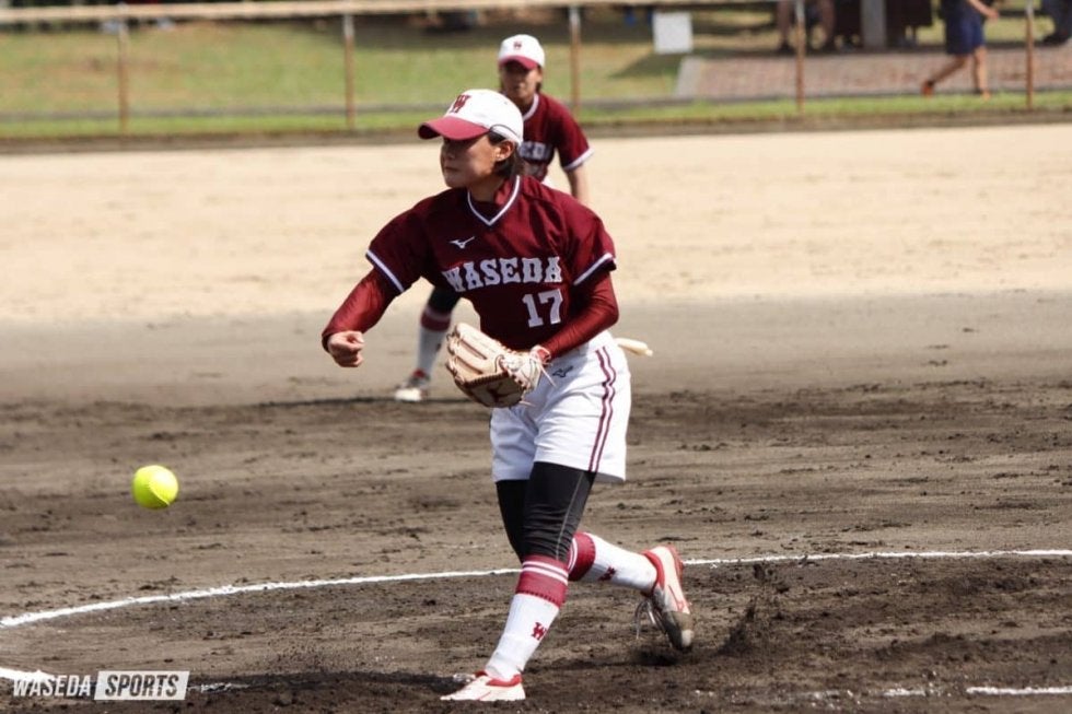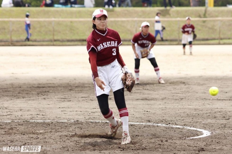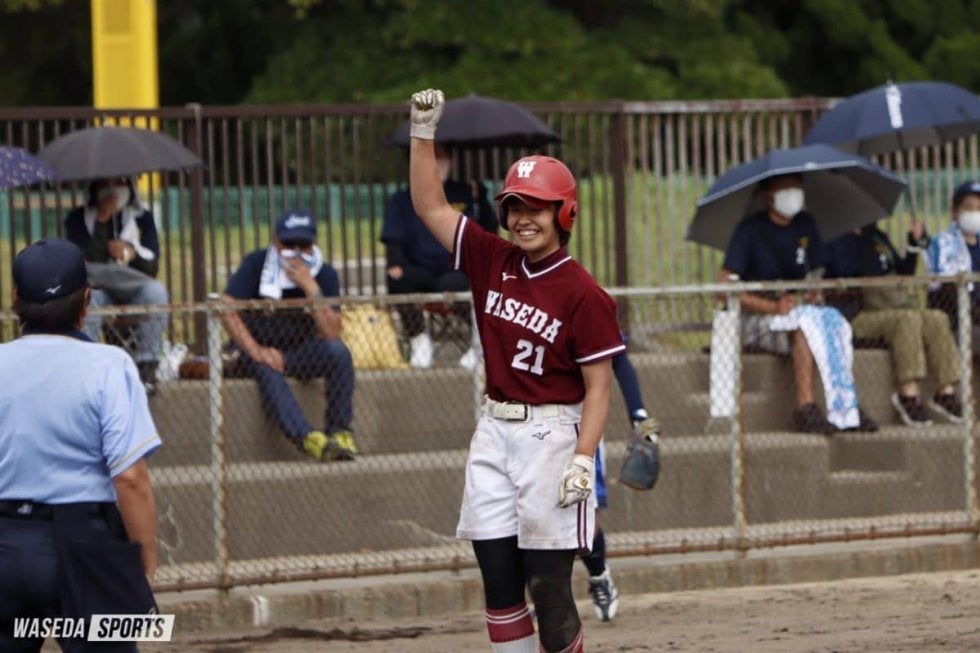 3回戦の清和大戦。1回裏、先頭の小林千晃(スポ2=千葉経大付)が右中間を破る三塁打で出塁すると、捕逸の間に小林が生還し、幸先よく1点を先制する。その後、四球で出塁した反町結佳主将(スポ4=愛知・瑞陵)が二盗を決め、3番高の左前打で2点目。なお無死満塁のチャンスを作り、6番松本日和(スポ3=東京・日大二)の中前打で1点を追加し、この回一挙に3点をあげた。以降両チームとも得点を奪うことができず、我慢の展開が続いた。試合が再び動いたのは4回。四球などで2死一、二塁のチャンスを作ると、高のあと少しで本塁打かと思われたフェンス直撃の二塁打で2点を追加。さらに守備がもたつく間に高が三塁まで進み、2死三塁で迎えるは4番の渡辺佳子(スポ4=東京・学習院女)。ここで渡辺が三遊間を抜ける安打を放ち、さらに1点を追加し、6-0とした。投手陣は、先発の田中が得点圏に走者を背負いながらも5回を無失点と粘投し、6回から後を継いだ新宮は、圧巻の投球で2イニングを無失点に抑えた。田中の好投がチームに良い流れをもたらし、打線がそれに応えたかたちとなり、順調に準決勝へと駒を進めた。