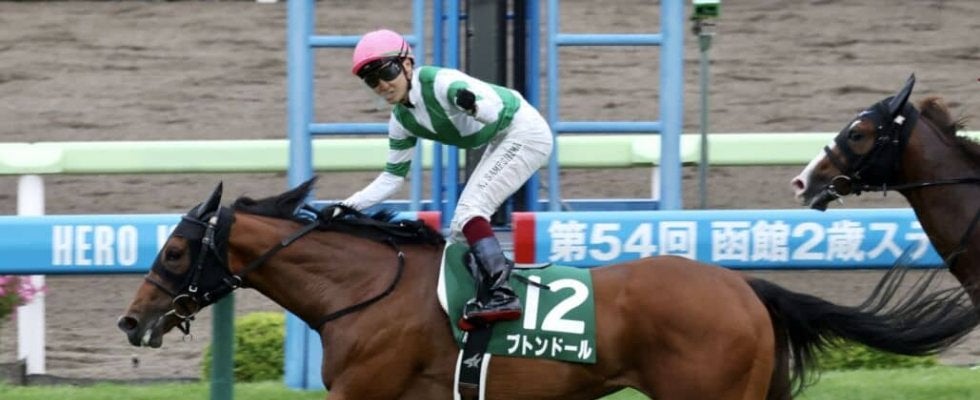16日、函館競馬場で行われた11R・函館2歳ステークス(G3・2歳オープン・芝1200m)は、鮫島克駿騎乗の4番人気、ブトンドール(牝2・栗東・池添学)が快勝した。1.1/4馬身差の2着に3番人気のクリダーム(牡2・栗東・須貝尚介)、3着にオマツリオトコ(牡2・美浦・伊藤圭三)が入った。勝ちタイムは1:11.8(稍重)。