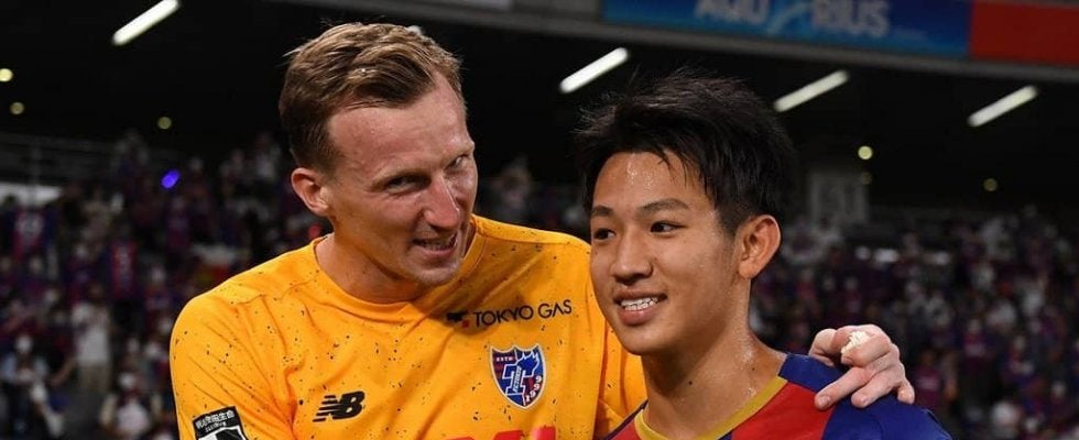 試合後、ヤクブ・スウォビィクに讃えられる梶浦勇輝 FC東京vsジュビロ磐田(20220717)撮影/原壮史
