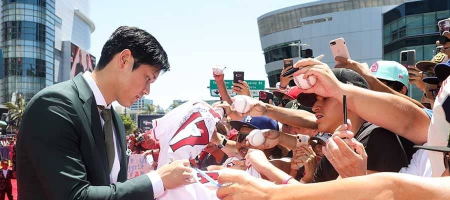 球宴レッドカーペットでファンにサインをするエンゼルスの大谷翔平【写真:Getty Images】