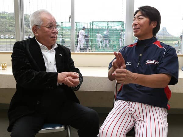 野村克也氏(左)と話をするヤクルトコーチ時代の高津監督(右)
