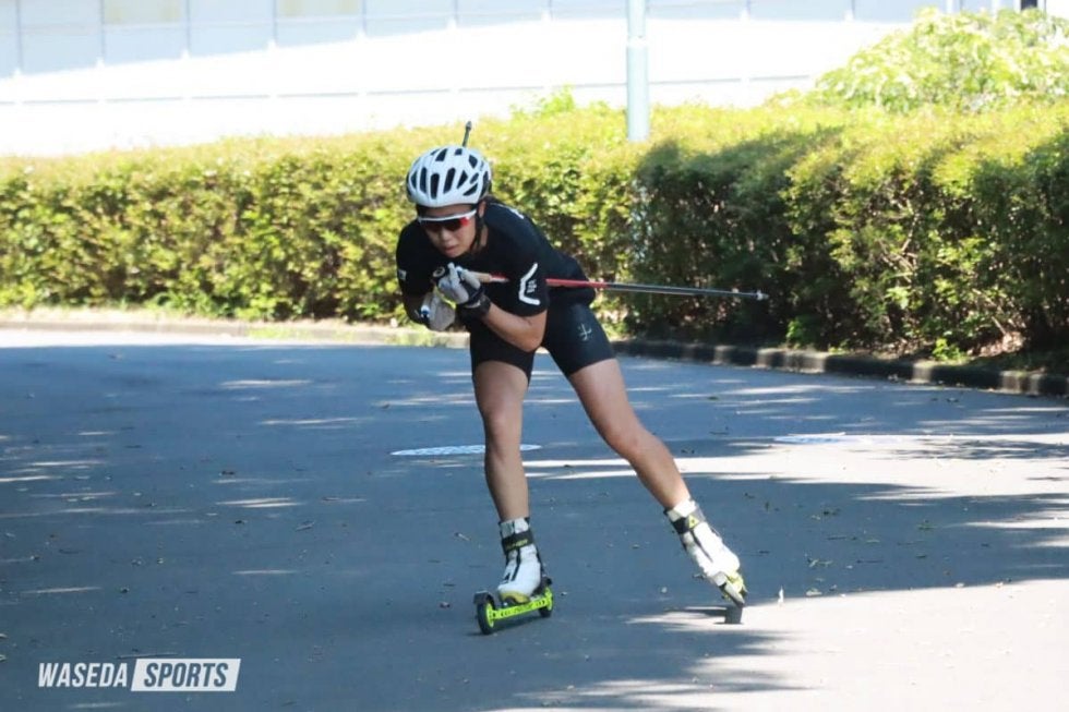 肌を刺すような日差しが照りつける中、スキー部クロスカントリー部門の練習が所沢キャンパスで行われていた。現在、スキー部は解散期間中。それぞれが所沢や地元で練習を重ねている。朝9時すぎから行われていた練習は、アスファルト上を走ることのできるローラースキーを使用した持久走と、スピードを出すショートダッシュ。夏場は雪上での練習を積むことができない中、それぞれが試合を意識しながら質の高い練習を行っていた。スキー競技において、夏は地盤固めの時期。フォームの定着、体力の向上などを図っているという。冬につなげることを意識しながら、各自が練習を進めた。