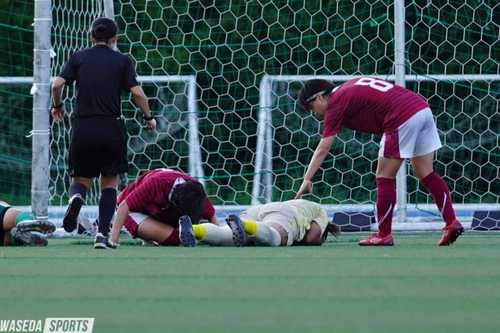 後半頭からFW廣澤真穂(スポ4=ノジマステラ神奈川相模原ドゥーエ)を投入し追加点を狙いに行くア女。ゲームを落ち着いてコントロールしながら、密集した中盤を飛ばすロングボールで一発を狙う。55分にはMF宗形みなみ(スポ1=マイナビ仙台レディースユース)が中盤から持ち出して、クロスに吉野が合わせるが相手GKに阻まれゴールとはならない。すると直後の56分、ラインの裏を取られペナルティ外から強烈なシュートを食らう。しかしここは守護神・近澤が涼しい顔で反応し、失点を許さない。攻撃では、中盤の底で宗形、最終ラインから一歩前に出たDF井上萌(スポ4=東京・十文字)の二人が長短のパスでタクトを振るい、展開を支配する。しかしアディショナルタイム、相手FWに裏抜けを許し、ヘディングシュートが飛び出した近澤の上を通過しネットを揺らす。まさかのドロー決着かと肝を冷やしたが、ここはオフサイドの判定で難を逃れた。結局お互いに得点は出ず、1-0で試合終了。前半の吉野の得点が、決勝点となった。