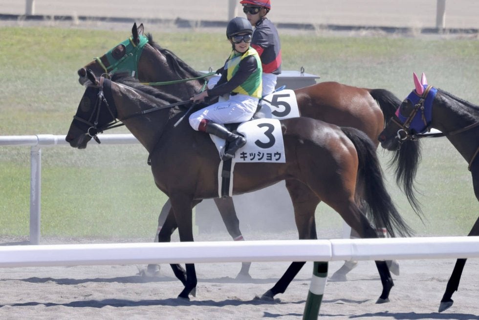 5番人気に支持された今村聖奈騎乗、キッショウが勝利し、同騎手は今期23勝目をマーク。昨日土曜新潟・2Rに続いて連日の勝利となった。直線では逃げ馬をピッタリマークして番手から猛追。併せ馬の激しい追い比べとなったが、2着馬にクビ差をつけて競り勝った。