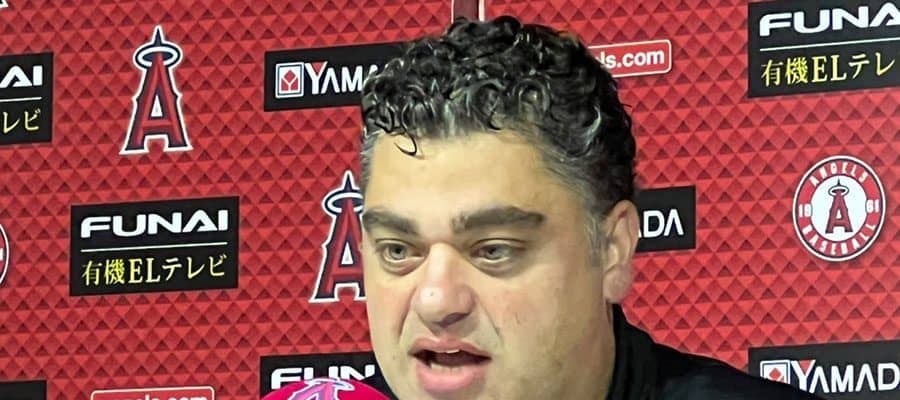 会見に応じたエンゼルスのペリー・ミナシアンGM【写真:盆子原浩二】