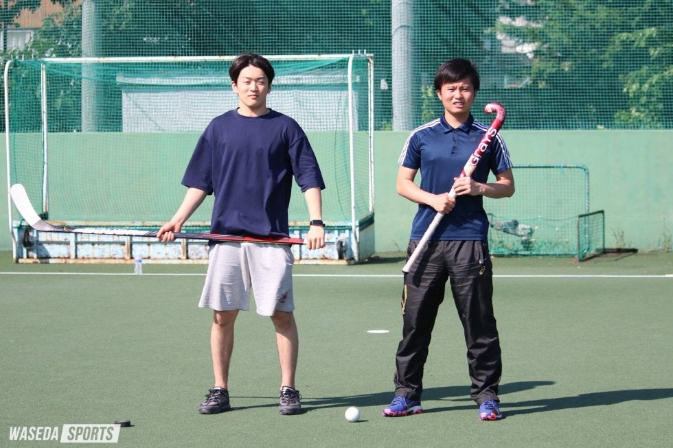 どちらも普段自分のスポーツを「ホッケー」と呼ぶ、グラウンドホッケーとアイスホッケー。ホッケー部GK西本京平主将(スポ4=大阪星光学院)とスケート部ホッケー部門のDF務台慎太郎主将(スポ4=北海道・駒大苫小牧)が初めて会い、対談を行った。戦う会場は違うが、やはりプレーは共通点がたくさん。さらにGKとDFとポジションは近く、主将としてのあり方も近い。グラウンドホッケーを体験しながら、それぞれの競技の魅力を語った。