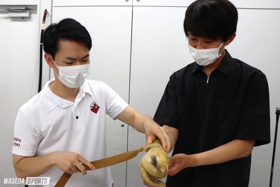 大澤 (構える際に)最初に弓を持ち上げるのですが、その時に体の正面で持ち上げることを正面、体の斜め側で持ち上げることを斜面といいます。全国的には正面の方が多くて、東京では斜面で引いている高校は3校しかないんです。地域によるものなので、西の方では斜面で引くところが多いです。それ(斜面で引いていること)が早稲田の特色なのかなと思います。関東の大学では3校しかないので、珍しい流派で引いてると言えます。