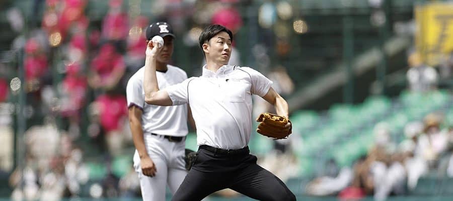 昨季限りで現役を引退した斎藤氏。ポロシャツ姿でマウンドに上がると、左打者の内角に威力のある直球を投げ込んだ。スタンドから大きな拍手が送られると両手を上げ応える場面もあった。