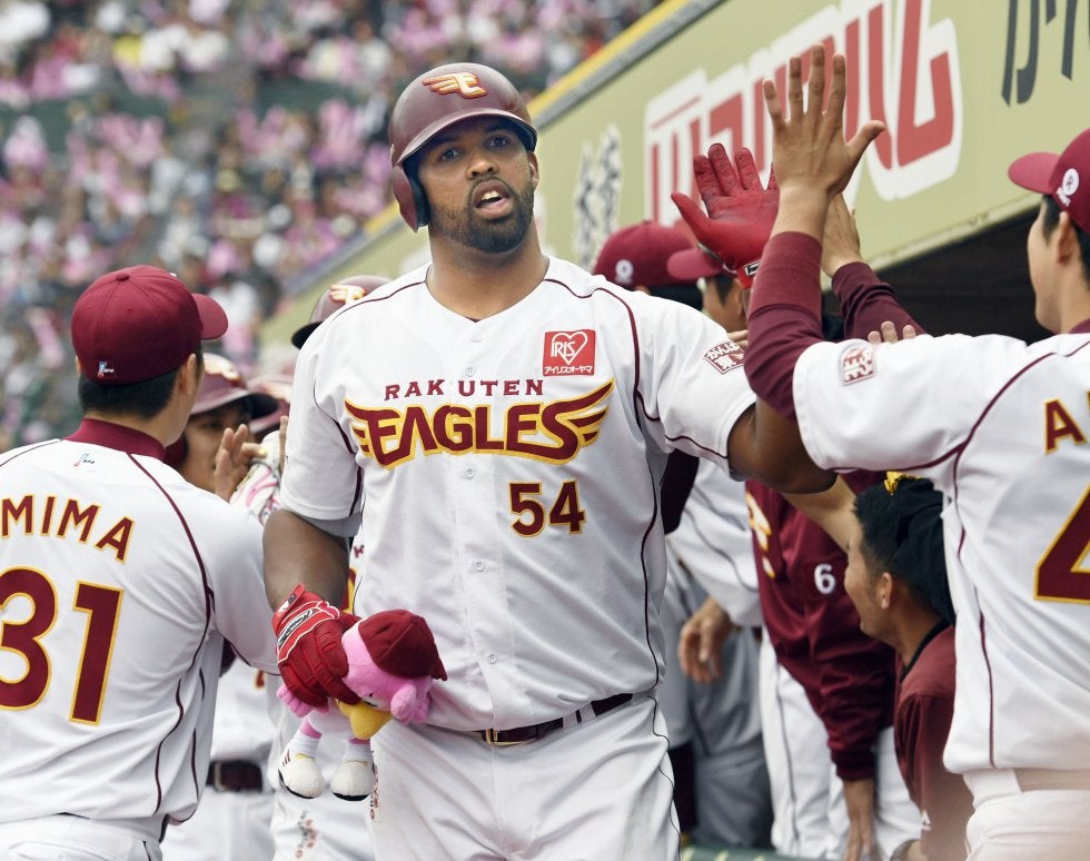 楽天―西武 4回、満塁本塁打を放ちナインに迎えられる楽天・ペゲーロ=Koboパーク宮城【写真提供:共同通信社】 東北楽…