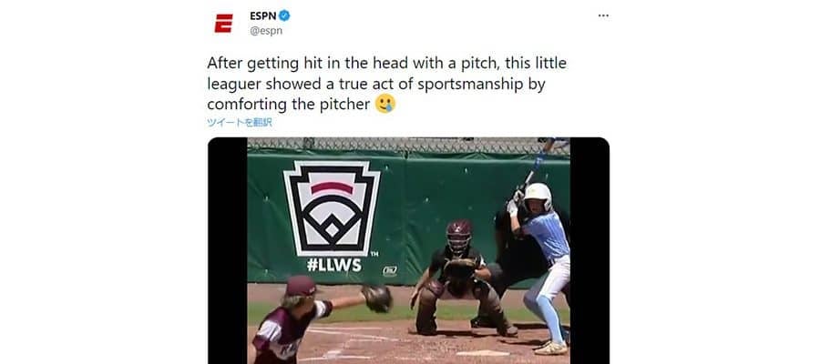 ナインも駆け寄って肩を叩く。客席もスタンディングオベーションとなり、涙を流す人もいた。一部始終の動画を米スポーツ専門局「ESPN」が公式ツイッターに公開。「頭部に死球を受けた後、このリトルリーグの選手が投手を慰め、真のスポーツマンシップを示した」とつづると、米ファンから称賛の声が上がった。