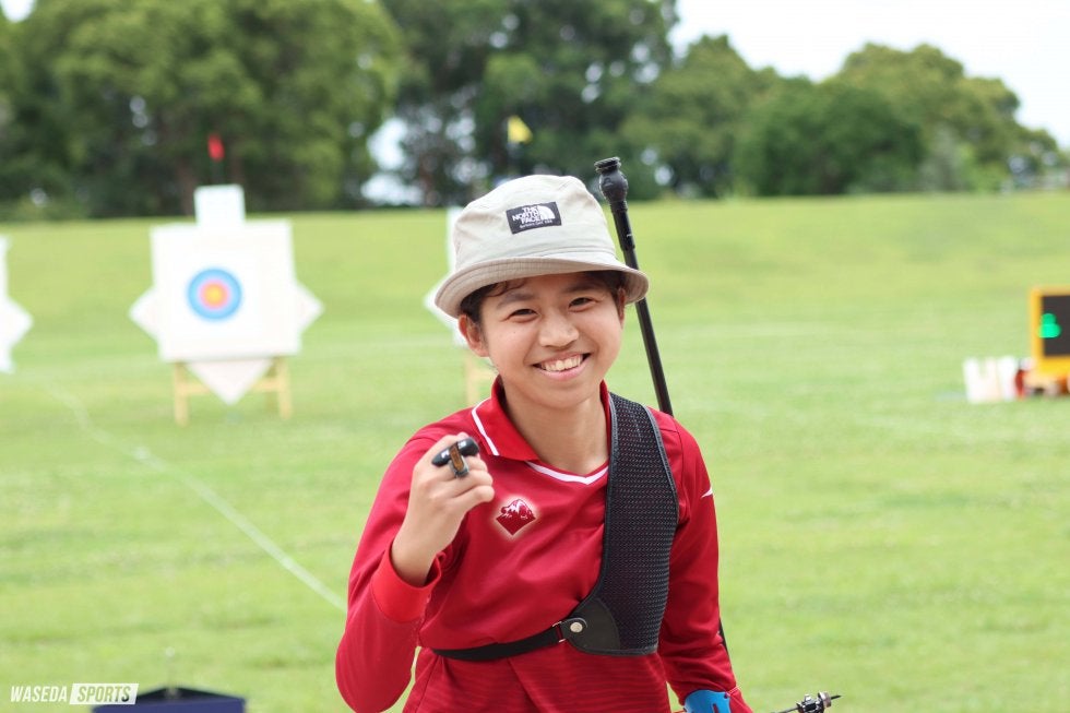 教えていただいた内容が少しずつハマってきた段階だったので、点数を出せて嬉しいです。また、今日は早稲田が多くてアットホームな雰囲気だったというのも心強かったです。30メートルの序盤であまり当たらなくて落ち込んでたところがあったのですが、(次の部に出場するために来ていた)愛佳さんや樹里(渋谷樹里、スポ1=エリートアカデミー)、立川(旺佑)くんが応援してくれて、気を持ち直して射つことができました。