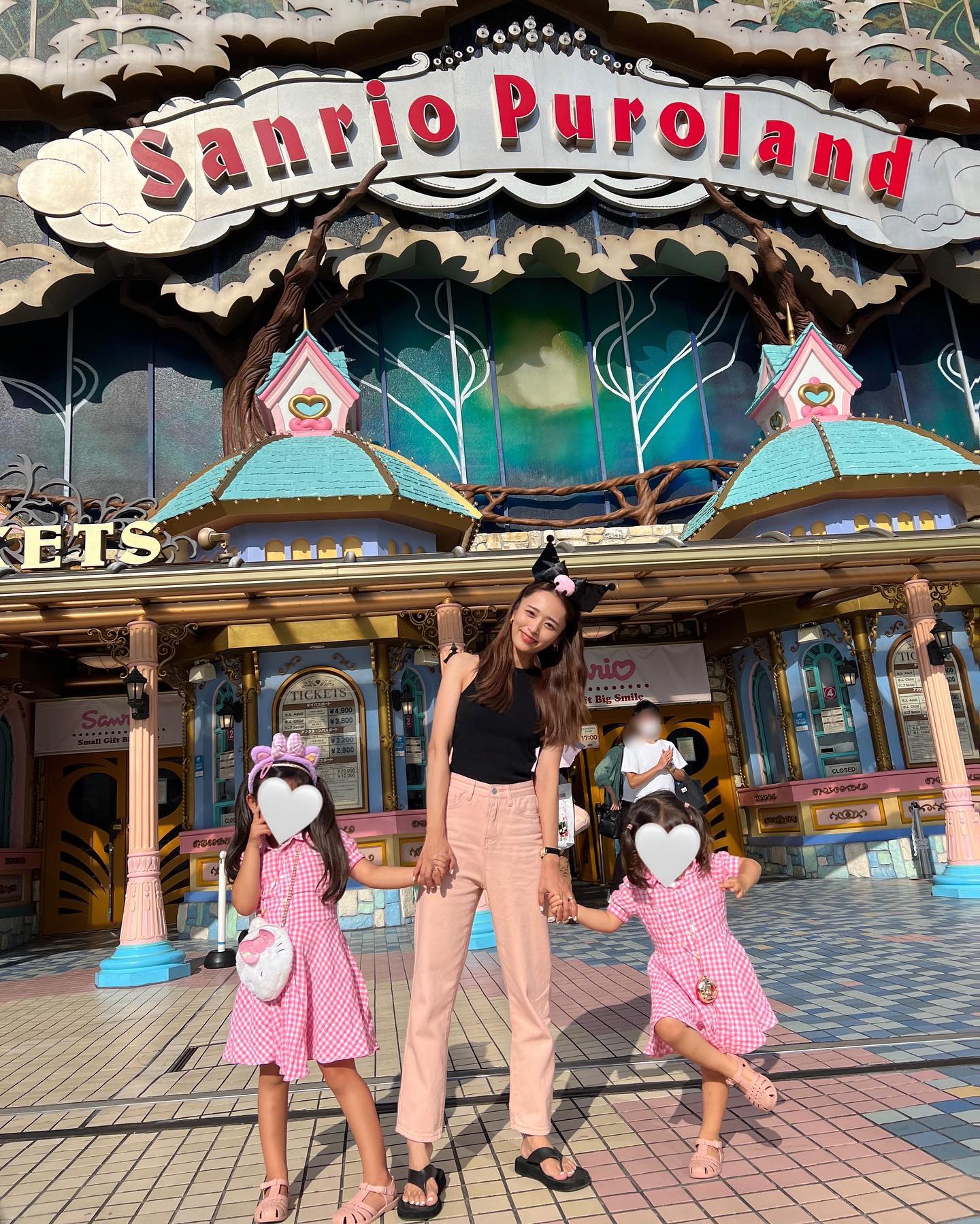 「久々にサンリオピューロランドに💕☺️」とつづり、6枚の写真をアップ。サンリオピューロランドの前で娘たちと映るショットをあげた。