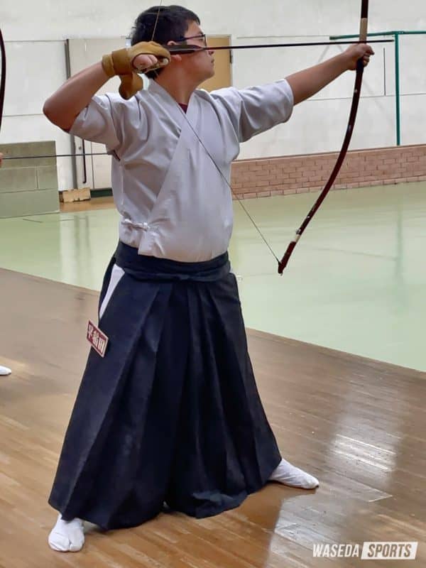早大男子も立ち上がりがあまり安定しない。壱ノ立は大前の竹宇治雄介(政経2=東京・早実)と落の宮﨑滉巳(社2=埼玉・県浦和)の2年生コンビが4射皆中するものの、16射11中で関学大に2中先行されるかたちに。弐ノ立でもその差を詰められず、2立目へ。ここで1年生が活躍する。壱ノ立の神山勝冴(創理1=東京・早大学院)や弐ノ立の佐藤我音(先理1=東京・早実)の4射皆中などもあり、2立目が終わった段階で一気に3中差をつけることに成功する。この立に出た8人中7人が3中以上という、猛烈な追い上げだった。その後は早大有利の展開が続く。2立目以降の全ての立で関学大より多くの的中を出し、最後は130中-109中と20中以上の差をつけて快勝した。