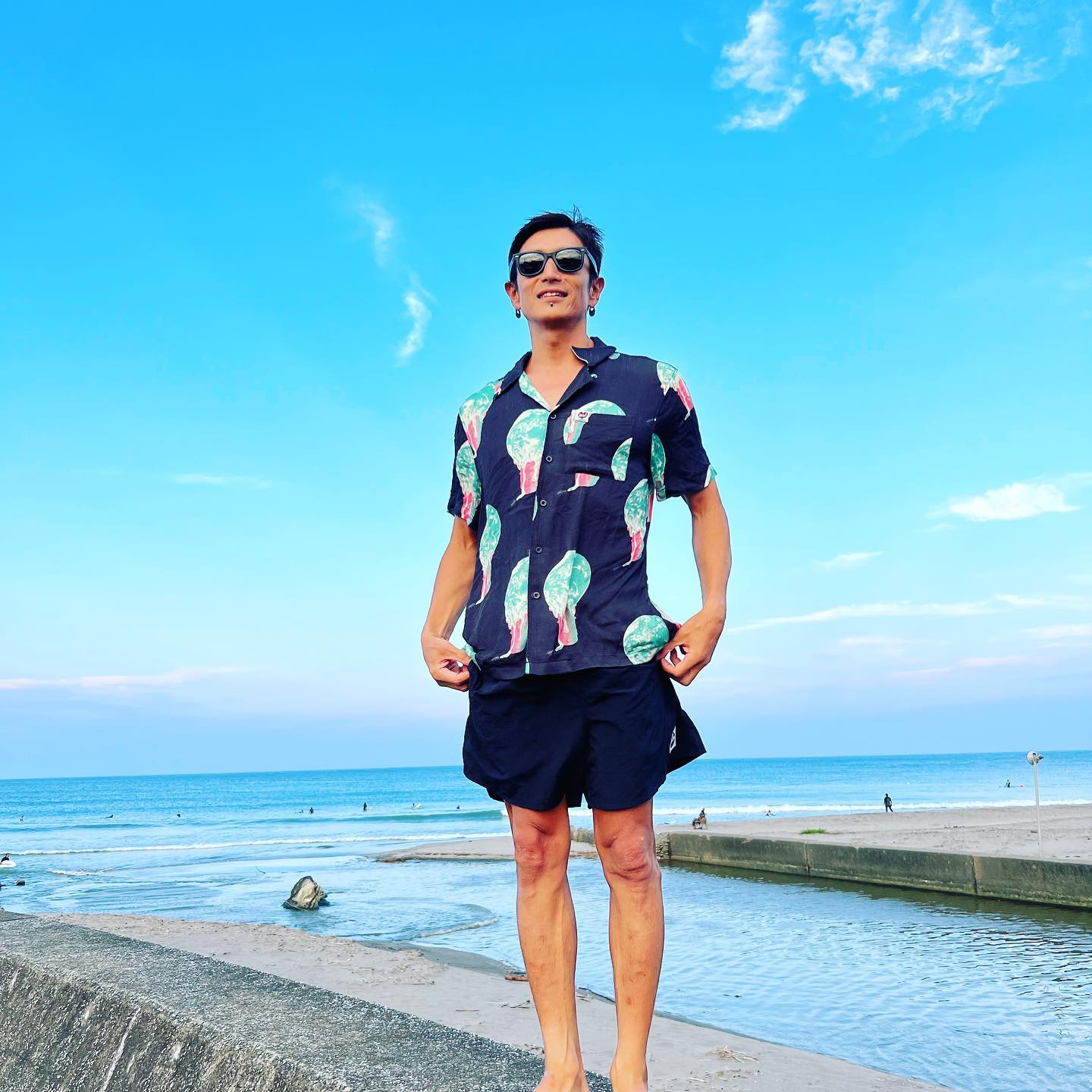 伊勢谷さんは海辺でのソロショットを披露し、英語でシャツの柄について「アイスクリームのように溶けていく地球」と紹介。続けて「お気に入りのシャツです」と綴った。